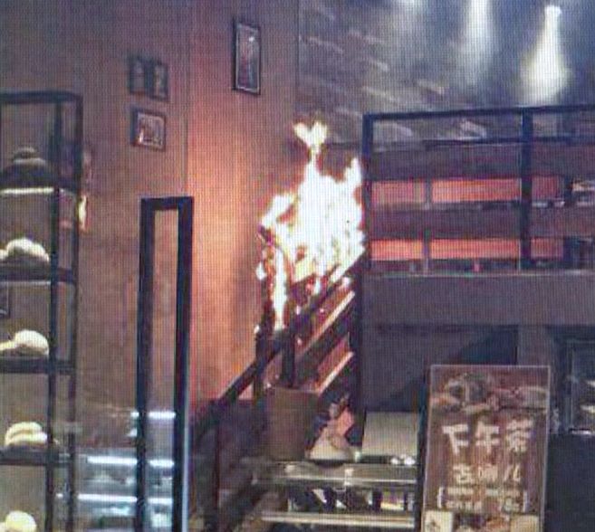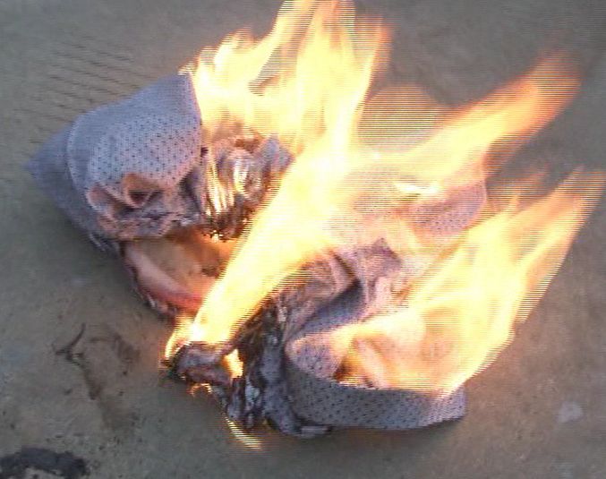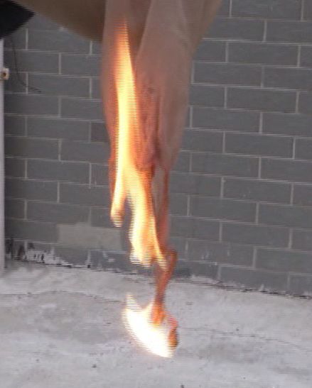 消防员首先用打火机靠近丝袜的尾端,结果丝袜被迅速点燃,并熔化成黑色的燃烧物滴落到地面,继而迅速冷却,如沥青一样凝固在一起。