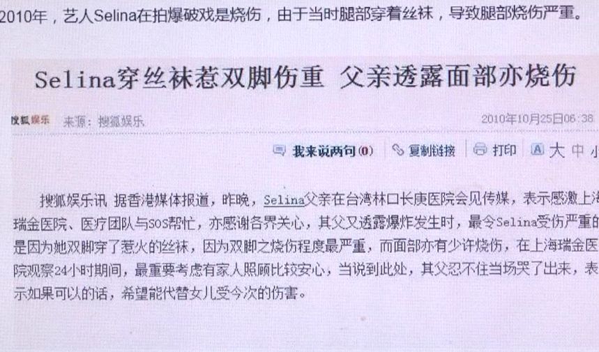 2010年,艺人Selina在拍爆破戏时被烧伤,由于当时腿部穿着丝袜,同样导致腿部烧伤严重。