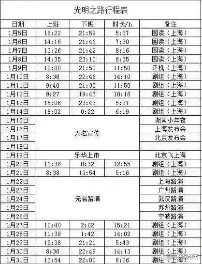 最近放出了王一博《光明之路》行程表,记录了王一博从1月份到2月底的行程,上下班的时间记录,也就是他每日工作时长。