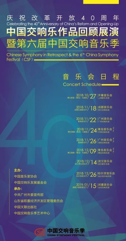 为庆祝改革开放四十周年,展示四十年来我国中青年作曲家的交响乐创作成果,中国音乐家协会、中国交响乐发展基金会主办,中共广州市委宣传部、山东省即墨经济开发区管理委员会、中国文联出版社、中国交响音乐季艺术中心承办,中国交响乐作品回顾展演暨第六届中国交响音乐季于2018年10月27日至2019年1月15日在北京、青岛即墨、成都、广州、武汉、哈尔滨等城市举行。