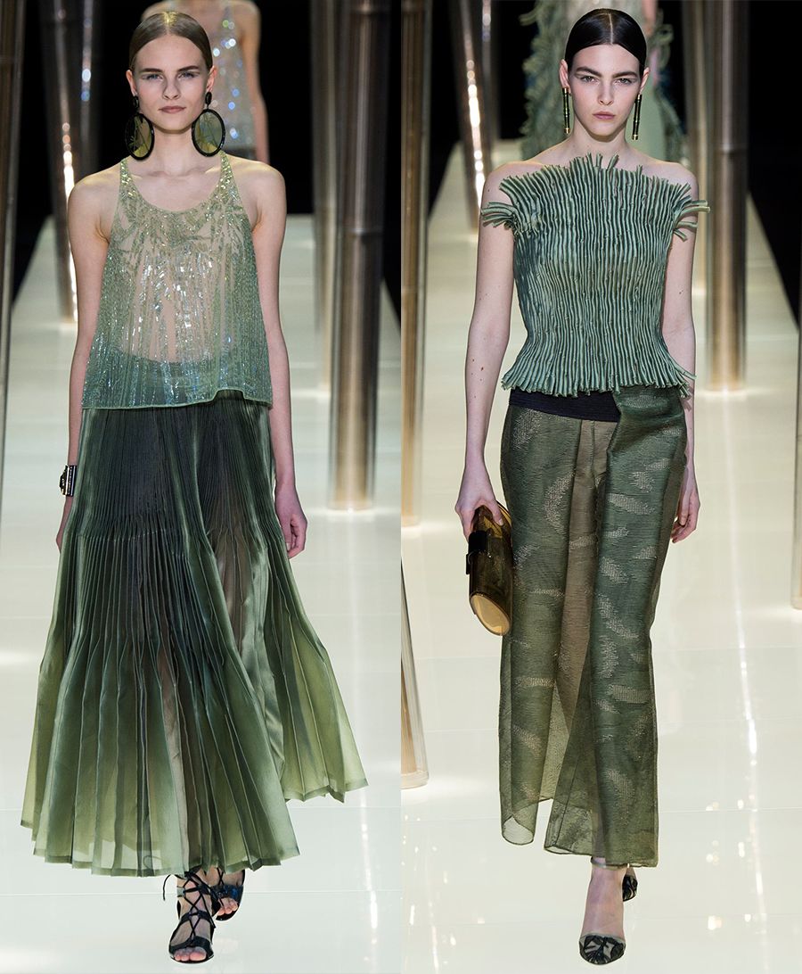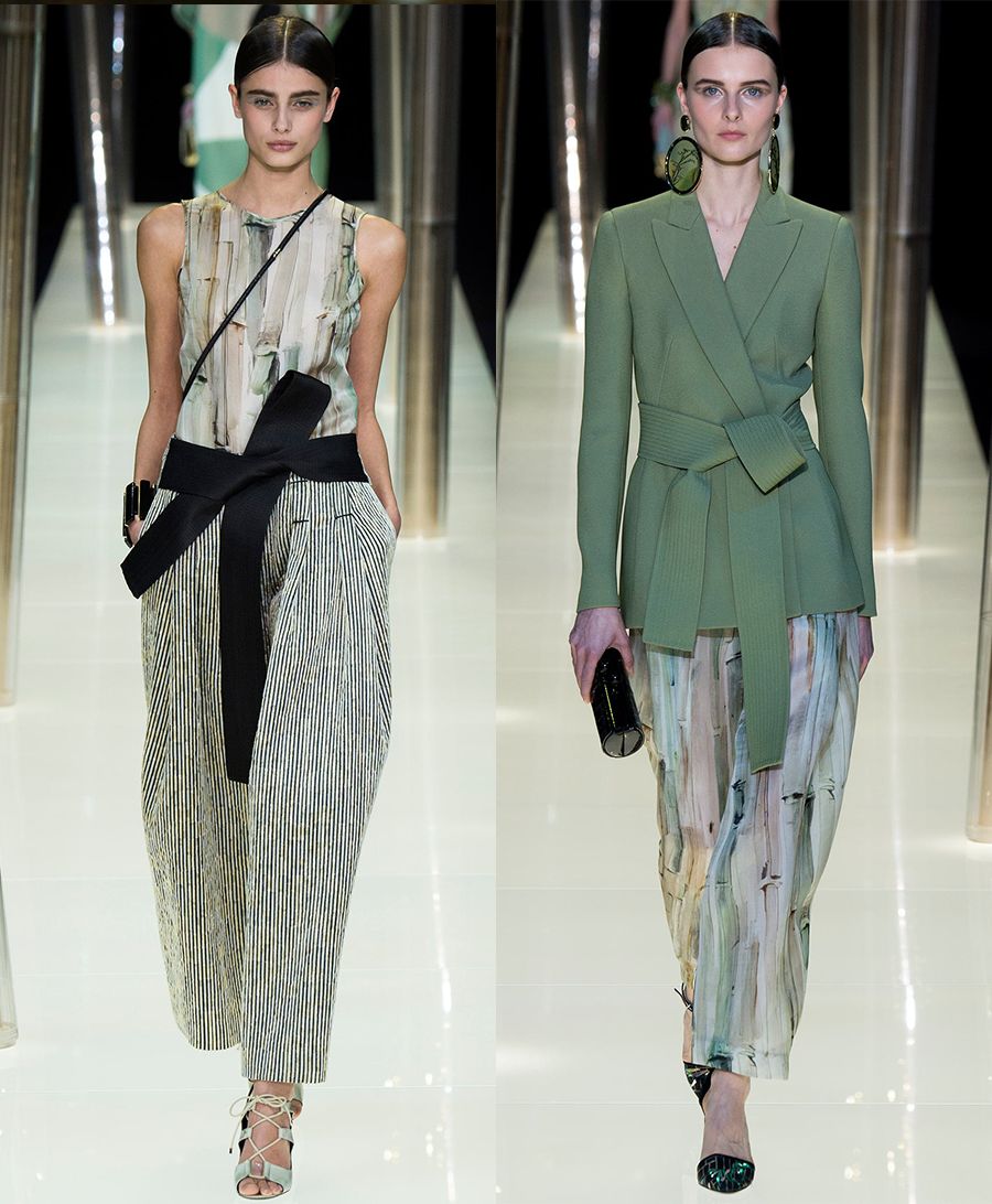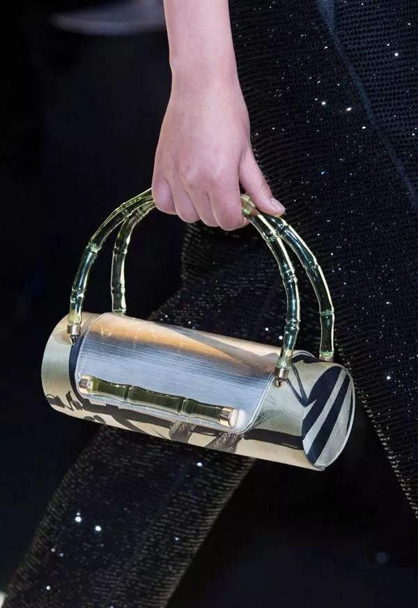 不局限于平面竹子印花,Armani还用手工串珠、拼在一起的缎面竹节模拟竹子在风中摇曳的状态。