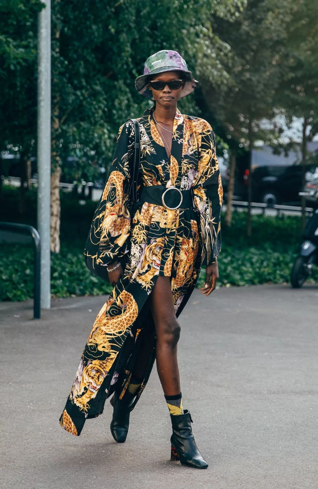 模特Shanelle Nyasiase还用带着龙虎图案印花的泡泡袖长裙配起街头风渔夫帽。