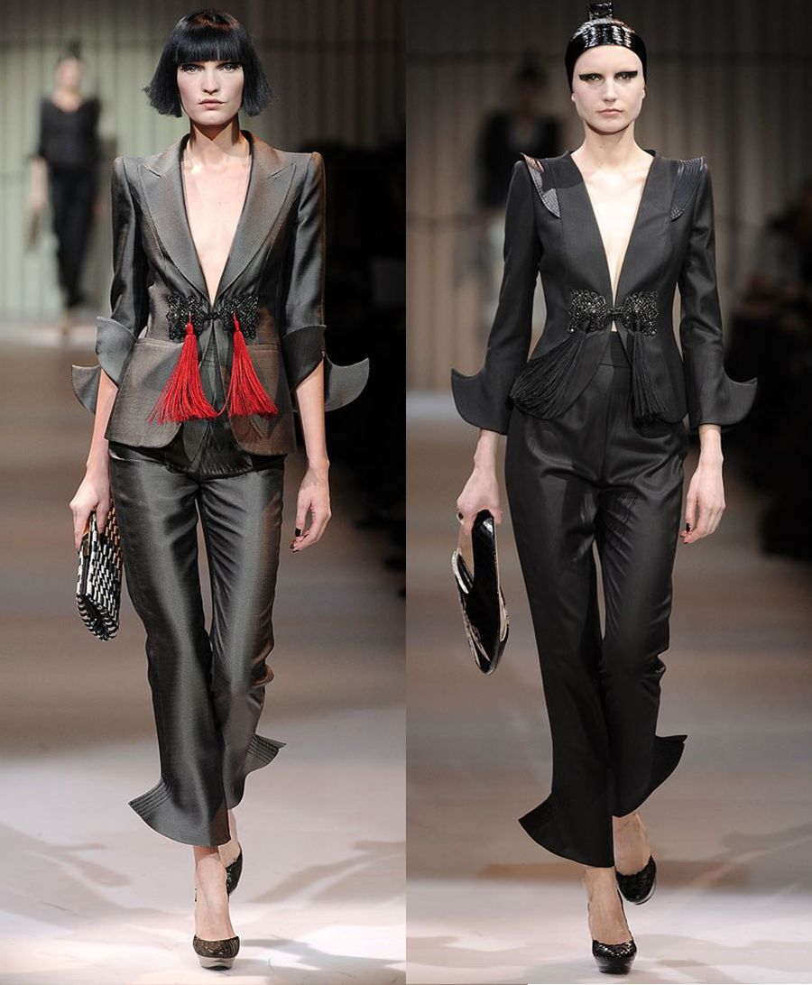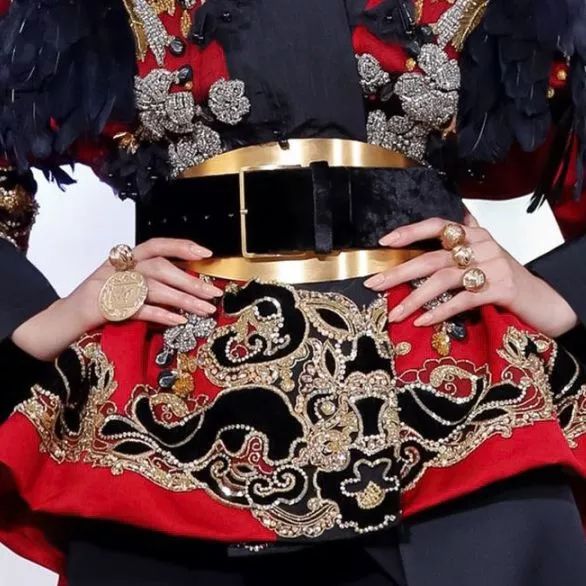 等中国元素到了阿玛尼老爷子手里,就又多了份硬朗和自信。Giorgio Armani将盘扣和吊穗元素融入硬挺的西装,飞袖也是从中国古建筑的屋檐汲取灵感,让人不禁惊叹这场“中西合璧”华丽得十分合理。