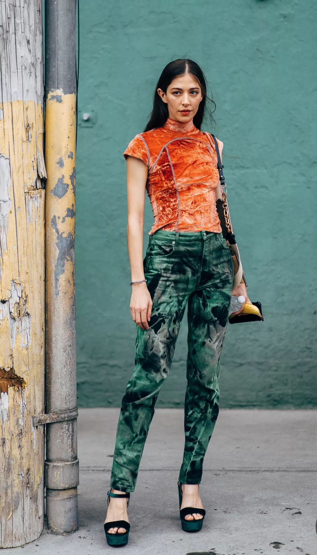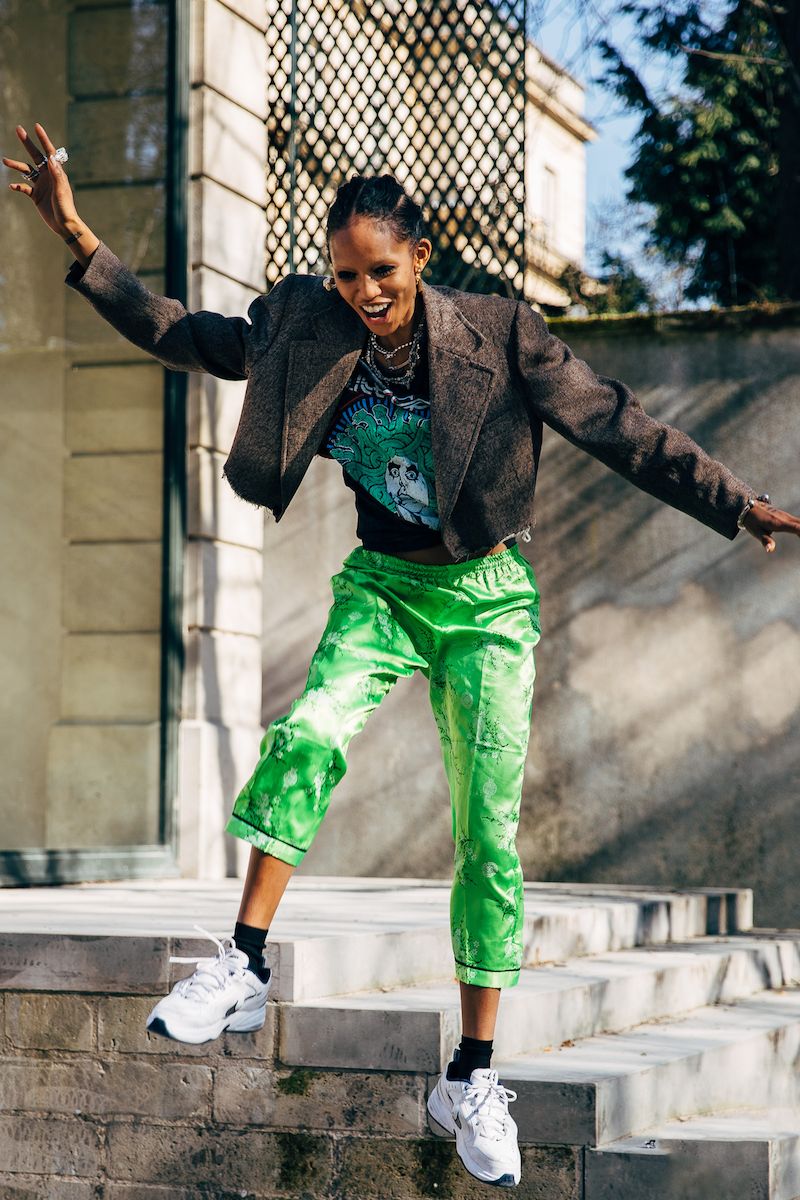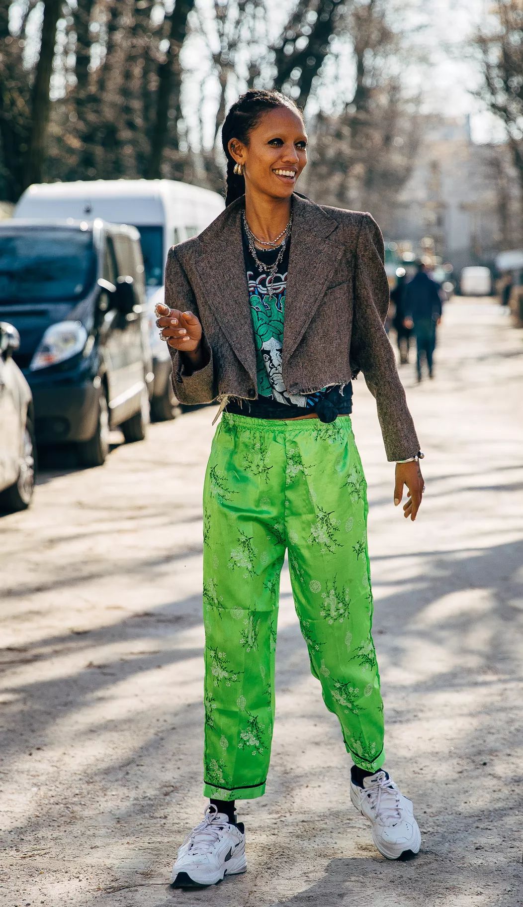 而模特Adesuwa Aighewi也用一条中国风的缎面睡裤玩起西装混搭,时髦个性得很。
