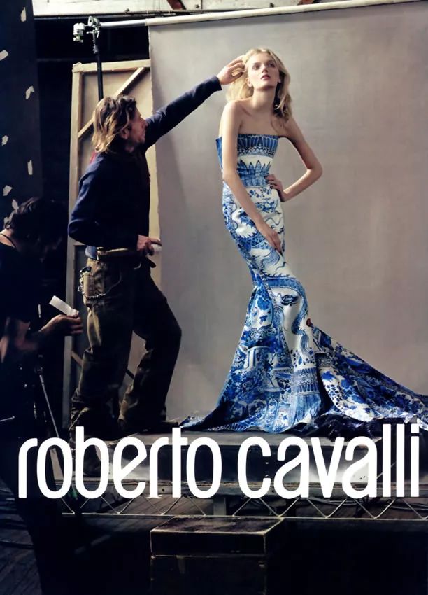2005年秋冬,Roberto Cavalli直接把中国青花瓷搬到了礼服裙上,精致的花纹和花瓶如出一辙,古典韵味与抹胸鱼尾礼服裙融合,新鲜感十足。