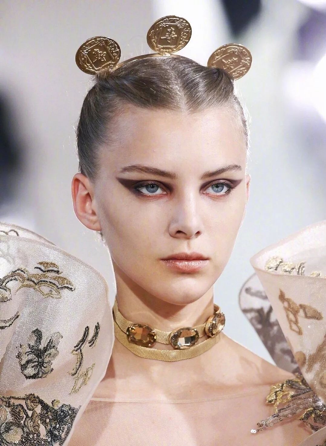 而前一阵Elie Saab 2019 秋冬高定系列也让东方元素大火了一把,模特们头上顶着写了“寿”字的铜钱公主发箍,想不到钱币还能用在这!
