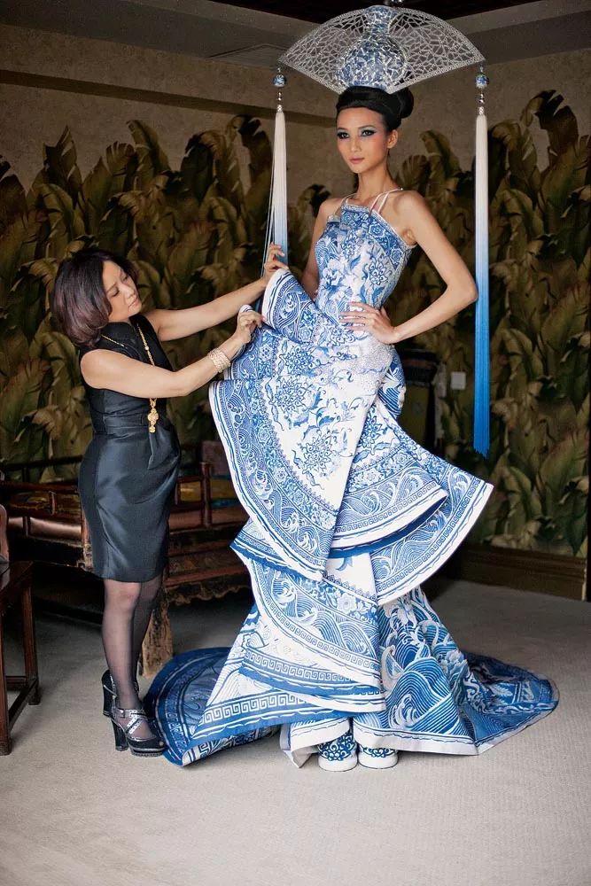 中国高定女王郭培当然也不会错过如此经典的中国元素,在2010年香港时装周上展出了这件来自她“一千零一夜”系列的青花瓷礼服裙。