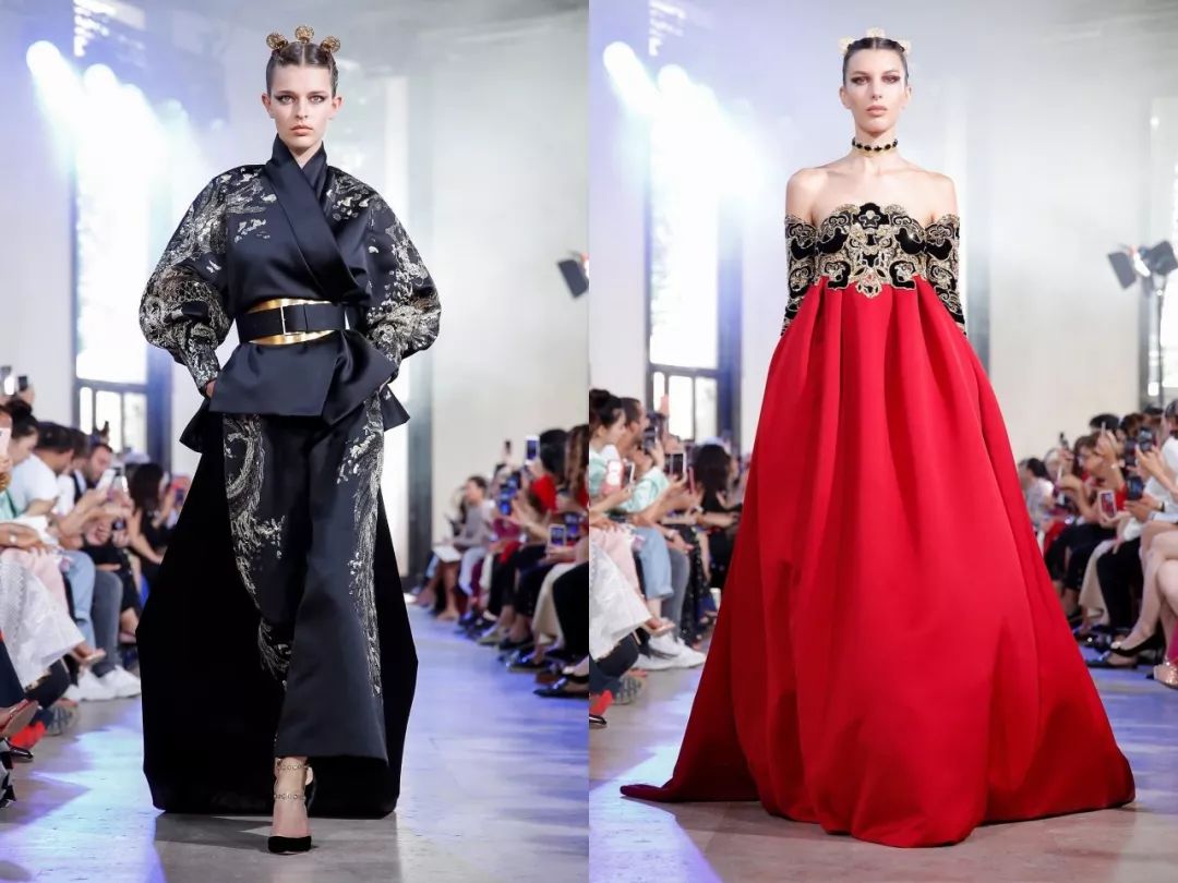 整场秀里中国风的刺绣印花、斜襟设计都带着浓郁的东方侠客气质,“寿”字铜钱发饰竟也能轻松配合宫廷风的奢华礼服裙,将东方韵味与欧式风情完美结合。