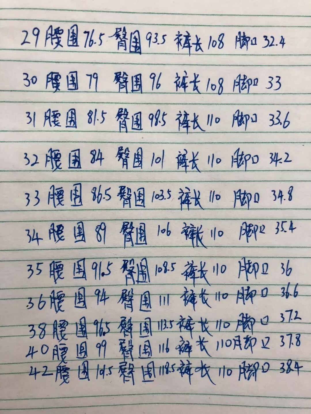 尺码 29 30 31 32 33 34 35 36 38 40 42
