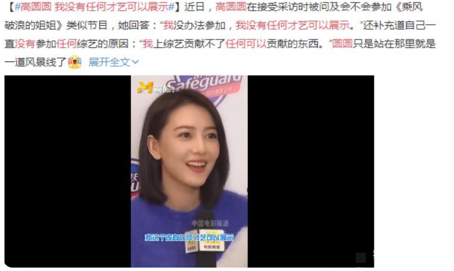 有记者建议高圆圆参加综艺《浪姐》,高圆圆说自己没有任何才艺可展示,在综艺里也贡献不了任何价值,她最适合的身份是「观众」。