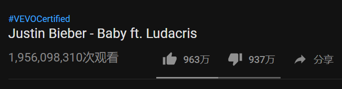 当然,传唱的越广,不喜欢的人也会越多,这首歌的 MV 不仅仅在油管上拿下了 19 亿的播放量,也成为了截止今日被人 diss 最多的一支MV。