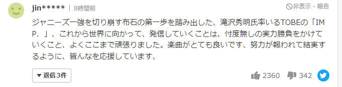 踏出了打破杰尼斯最强位置的第一步,泷泽秀明率领的“IMP .”他们真的很努力了!歌曲很好听,努力会有回报,我支持IMP .所有人。