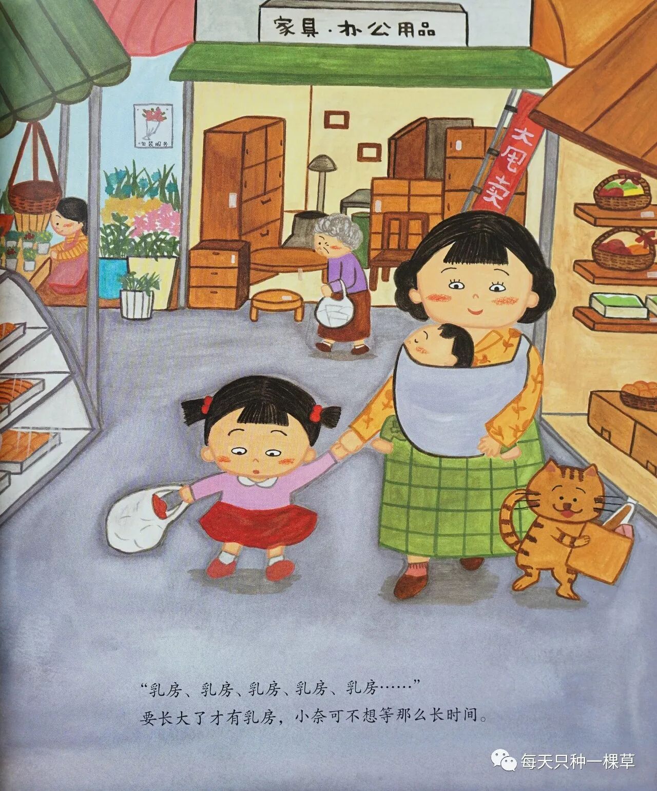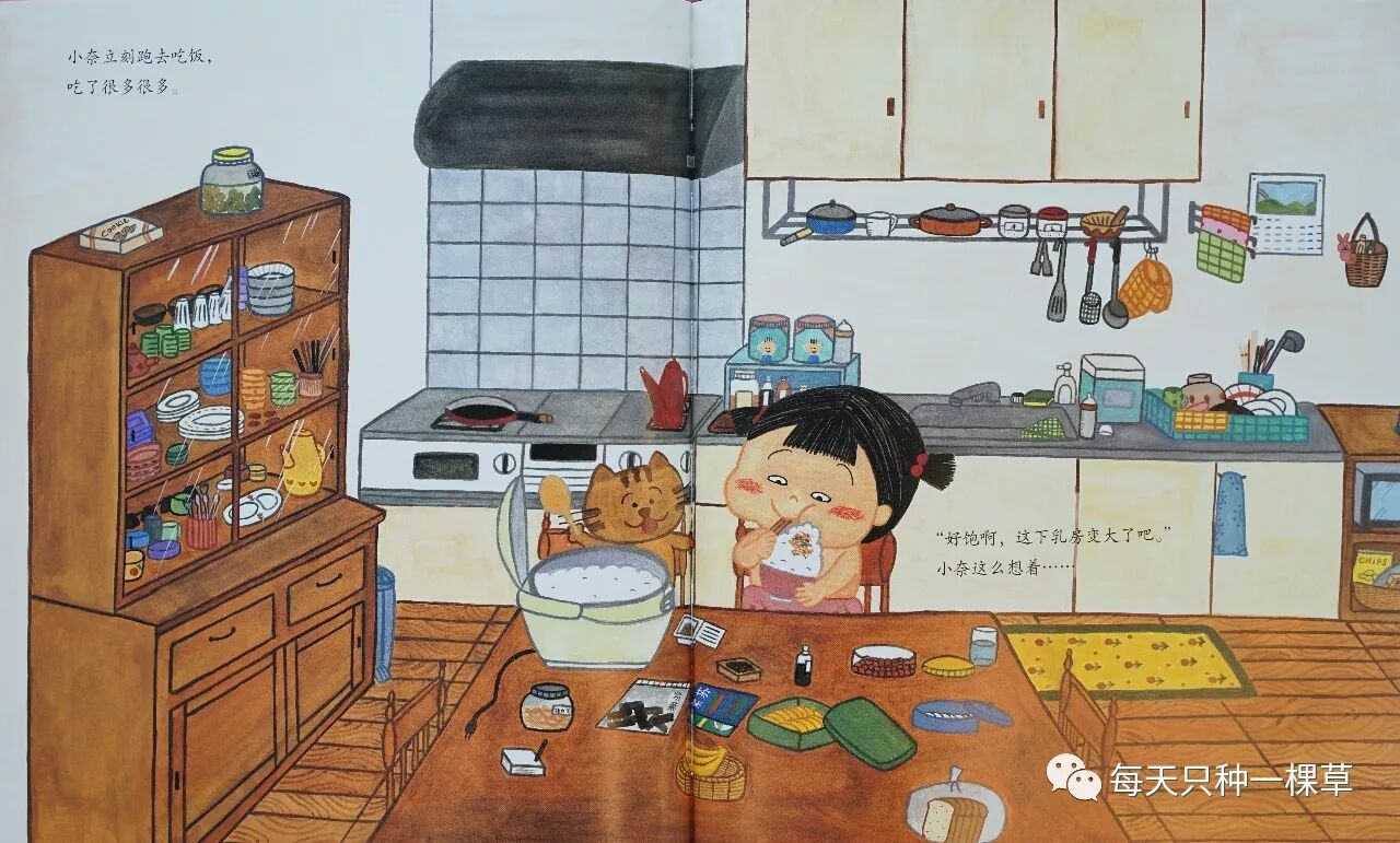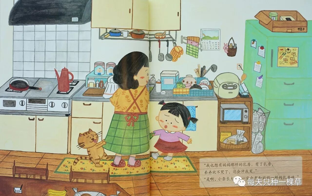 我每次打开来读,都深深爱上。也谈不上有什么复杂的剧情,就是因为弟弟一喝奶就不哭,所以姐姐小奈希望能像妈妈一样拥有一对乳房。
