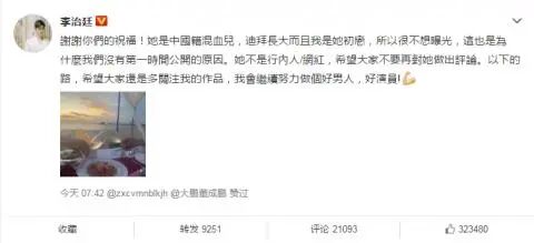 10月19日,演员李治廷被曝光为一神秘女子庆生,期间被拍下二人深情拥吻的照片,疑似恋情曝光。随后,李治廷本人亲自发文回应,承认恋情属实,并表示这是他的初恋女友。