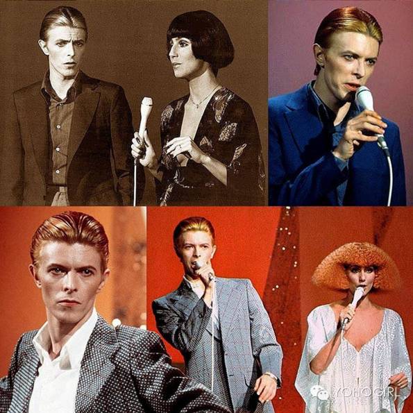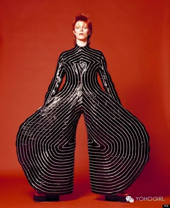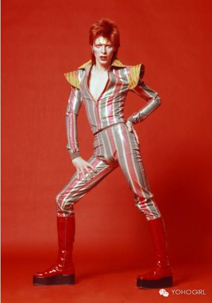 David Bowie游走於男女之间的衣着大胆,因此赢得「变色龙」的称号,口红丶金色眼影丶胭脂完全不是难题,珠片衫跟连身紧身衣也是标志性造型,由里到外都散发着奢华夸张的妖艳。