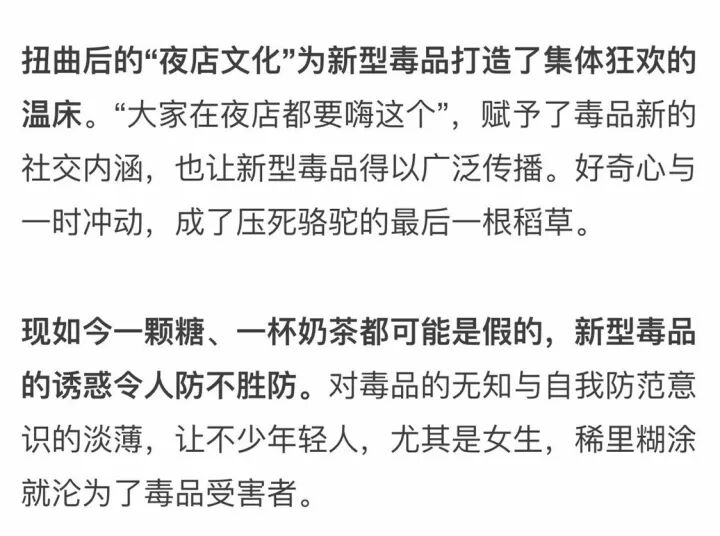 从大多受害女生事后的描述来看,她们并不知道自己在吸毒,都天真地以为那只是一杯普通的饮料。无知少女们一个个落入了新型毒品的圈套,在本应最美的年华黯淡无光。