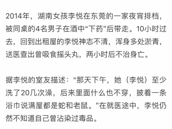 正如李悦的经历一般,新型毒品是夜店里“捡尸”、迷奸的惯用手段。所谓“捡尸”,是指女生因饮酒过度而醉倒后,男生将其带走发生性关系的行为。在台湾新北市信义区甚至有一条“捡尸大道”,而那里也正是夜店林立。