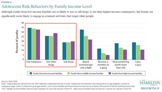 美国的一项调查显示,出身低收入家庭的孩子(深绿色)更容易在青春期参与和毒品相关的高风险犯罪活动/BROOKINGS