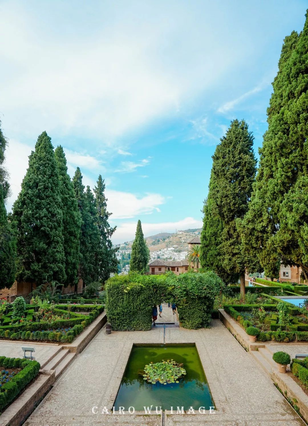 沿着阿尔罕布拉宫的围墙往赫内拉里菲宫走,一路上有亭榭喷泉相伴,和相对简单的皇家庭院相比,阿拉伯人对庭院的设计让人印象深刻。赫内拉里菲宫在阿拉伯文里的意思是“建筑师的花园”,这里也确实设计的十分精巧。