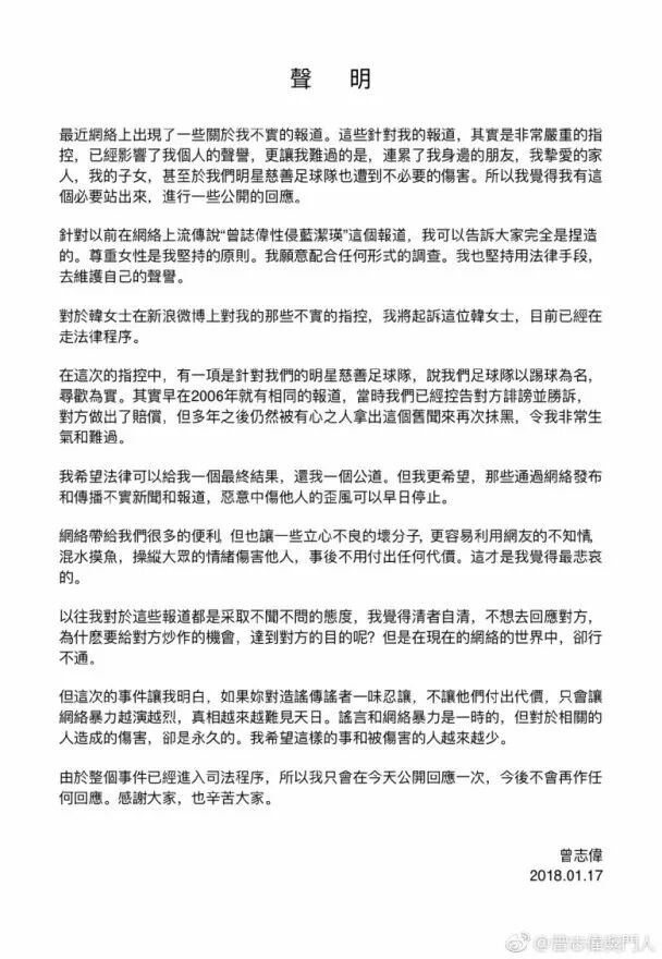 志伟续说:「近日网络流传『曾志伟性侵蓝洁瑛』一事,系完全捏造,尊重女性系我坚持嘅原则,我愿意配合任何形式嘅调查,我亦坚持用法律手段去维护自己嘅声誉。而对于韩女士喺新浪微博上对我嘅不实指控,我将会作出起诉,目前已经进入法律程序。」