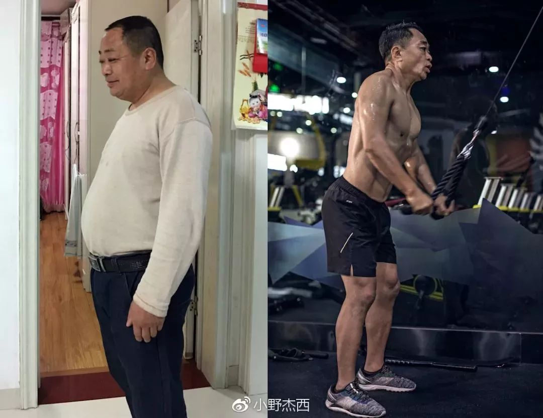 减去40多斤的父亲,啤酒肚没了,六块腹肌清晰可见,一下子年轻了好几岁。