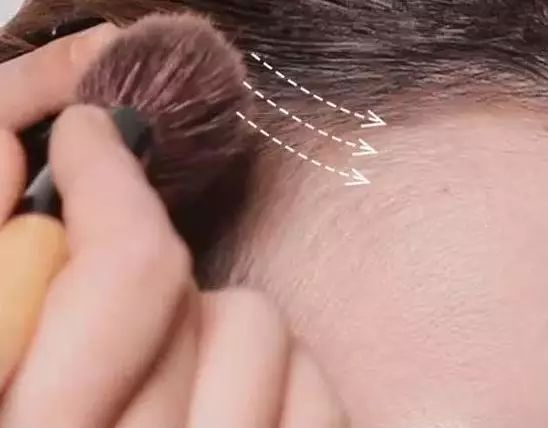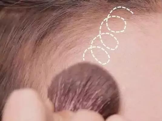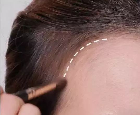 Step 1:用眉笔沿着头发生长方向来“画头发”,重点填补空隙,勾勒出想要的发际线的线条。然后用眼影刷将画好的线条晕染开,打造自然的效果~▼