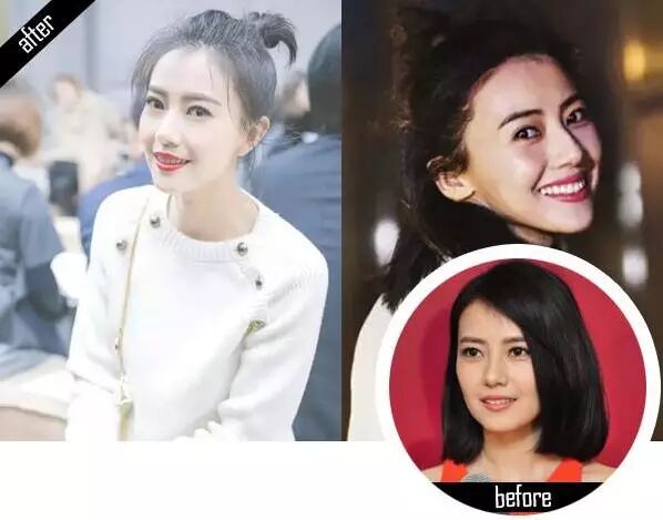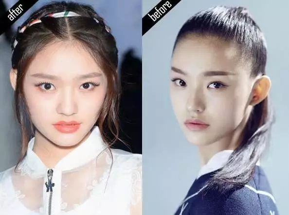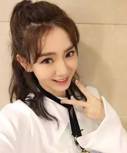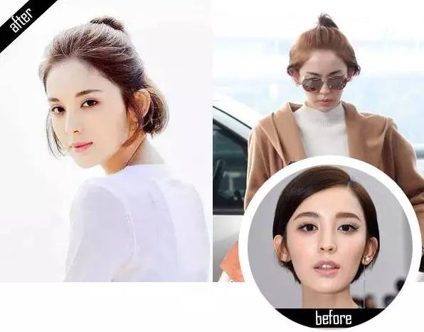 ▼看腻了张天爱的大斜分刘海,就会觉得她的脸型有点刻板。当有一天扎起了半丸子头,又把斜刘海换成了碎头发,一下子就变成了“心形脸”。