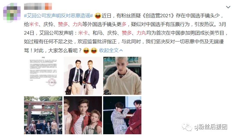 打压到底是否存在,明眼人看完节目就知道真相,引出该讨论点的源头,便是艾回送到《创造营》的选手,和马因家事退赛,目前只剩米卡、庆怜、力丸、赞多。