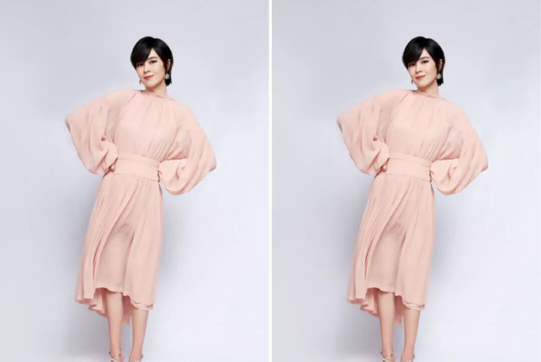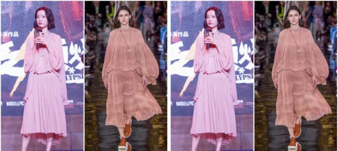 身穿一袭嫩粉色的连衣裙,设计中充满了细节和精致感,尽显随性飘逸。宽大的设计远看有种麻袋加身的感觉,“大水袖”的设计舒适又不失美感,腰间收叠的效果看起来很有层次和下垂感,色调和款式都让人感觉很舒服。