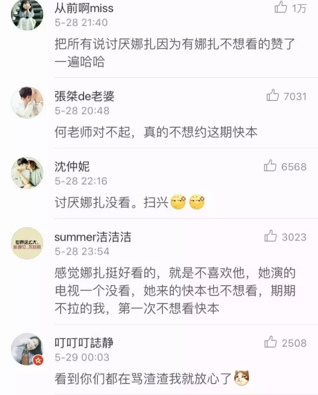 剧组上快乐大本营宣传,何炅刚在自己的微博里发预告,底下的热门评论一溜儿都是说不喜欢娜扎的。