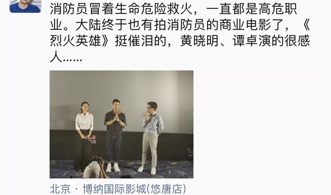 《烈火英雄》路演的时候,有个观众说,觉得黄晓明适合这个角色。因为他当时某次大爆炸后,第一时间捐出200万和吴京等人建立了真心英雄基金,用于帮助事件中牺牲的消防员队员家属。
