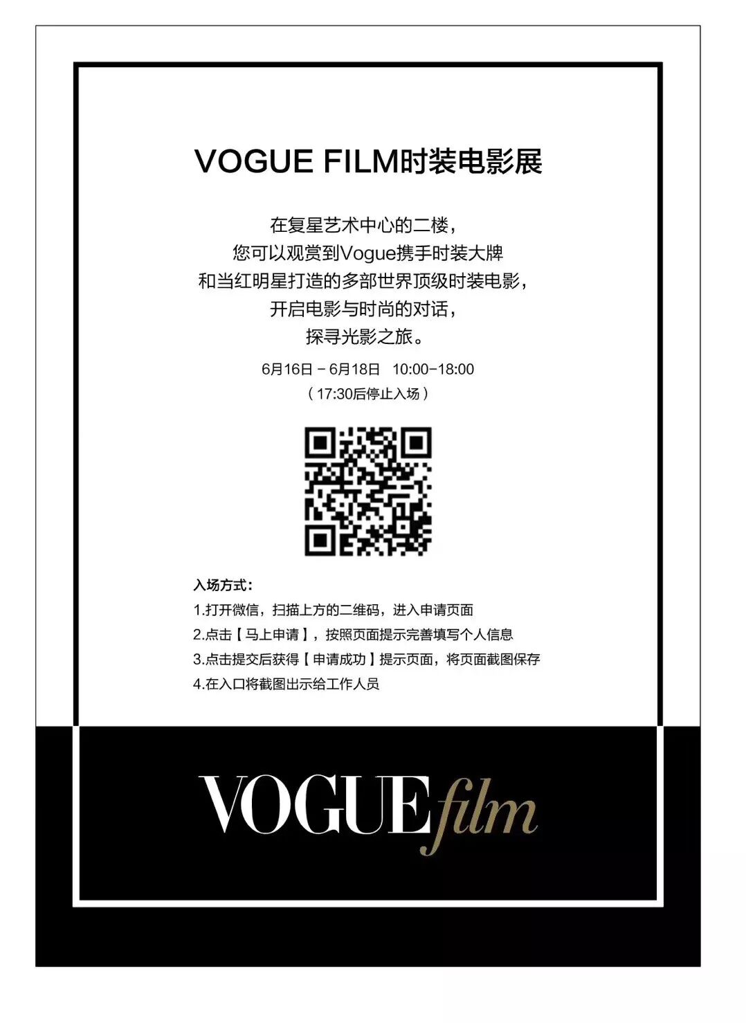 6月16日 - 6月18日, Vogue还特别设立了“VOGUE FILM时装电影展”公众开放日,时尚与电影爱好者,可以通过官方网站预约并亲临现场,观赏Vogue Film携手一线大牌和重磅明星打造的多达25部顶级时装电影。明星都流连忘返的展览,怎么能错过?