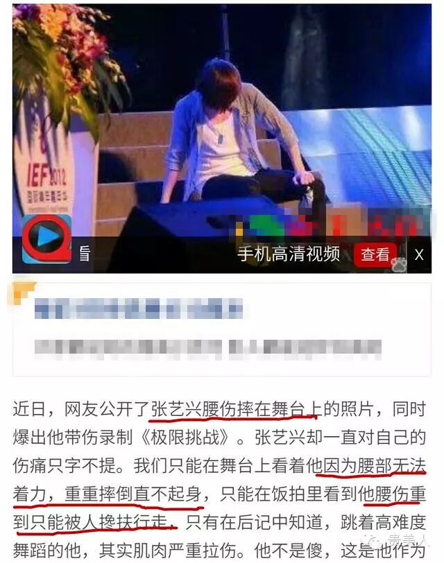 张艺兴还曾经因为腰伤在舞台上摔倒过↓