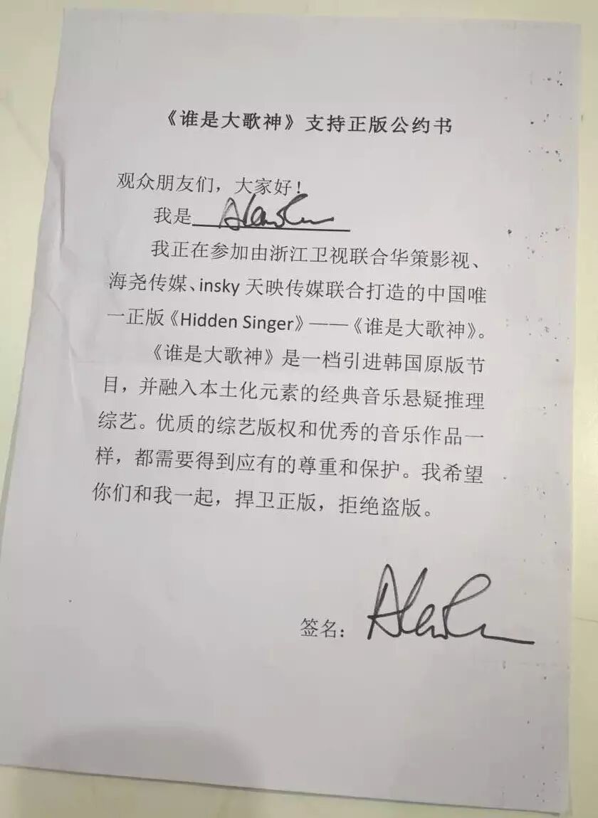 宣传片中,咏麟一上来就竖起大拇指给给节目点了个大大的赞,呼吁广大观众“尊重音乐,支持中国唯一正版《Hidden Singer》”。继之,“校长”还风趣地邀请观众参与到节目的互动中,“谁是大歌神,等你来评判”。此外,节目组还首度曝光了谭咏麟亲笔签名的《<谁是大歌神>支持正版公约书》,在这份公约书的最后,谭咏麟向观众发出诚挚的呼吁:“优秀的综艺版权和优秀的音乐作品一样,都需要得到应有的尊重和保护。我希望你们和我一起,捍卫正版,拒绝盗版。”