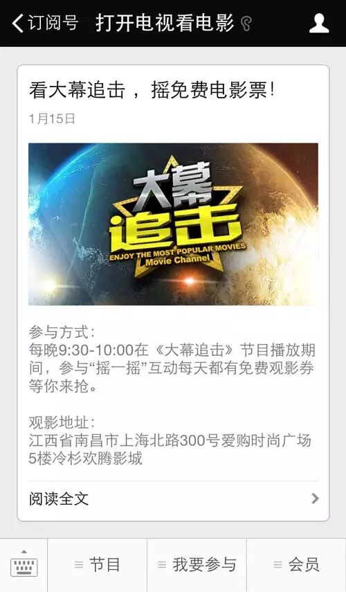 参与方式:每天21:30—22:00在《大幕追击》节目播放期间,参与“摇一摇”互动就有机会获取免费观影券。