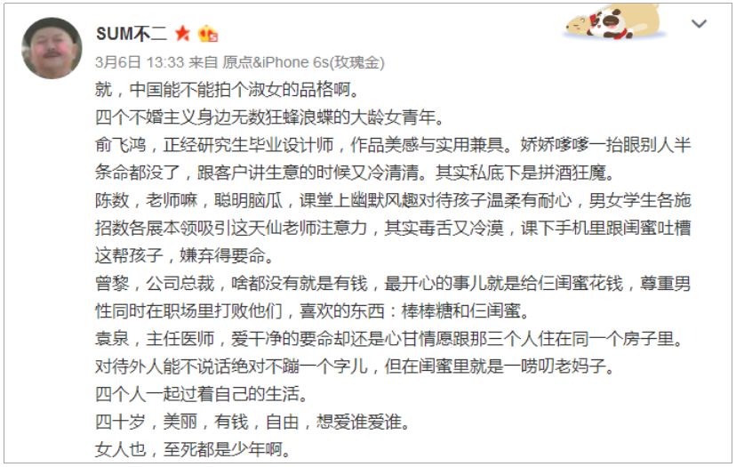 估计这会国产剧的制作团队们有点看不懂了,四个中年单身女人,没有婆媳争斗,没有小三撕逼,最可怕的是,还不让有男主角?