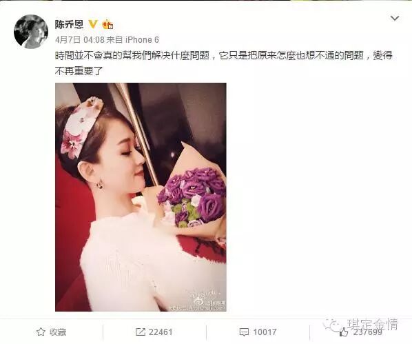 这么优秀的乔恩,难道就没有心爱的人疼她?等等,小编回忆了下,陈乔恩是霍建华唯一承认有过恋情的女生(在和林心如公布恋情之前)。想必在今年5月20号让林心如和霍建华的告白塞了一把狗粮吧?同时也让霍恩党心碎了。but,时过境迁,大家各自安好。