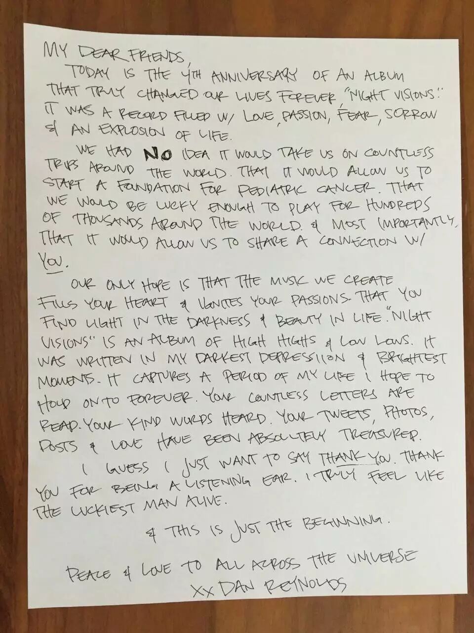 在专辑"Night Visions"发行四周年时,大丹手写了一份给歌迷的信,他在信中说到,"我们只想通过自己创造的音乐来填满你们的内心,让你们在黑暗中找到光芒,在生活中捕捉美好,并点燃内心的火焰!"