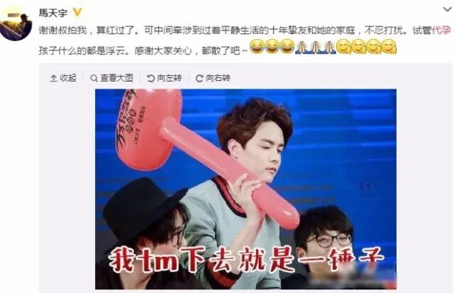 马天宇试管代孕生子的消息炒了好多天,当事人终于开口回应。3月22日中午,马天宇在微博中进行了否认,并呼吁大家“散了吧”。尽管回应的言辞克制,但所发图片上的配文却暴露了他的情绪:我tm下去就是一锤子。