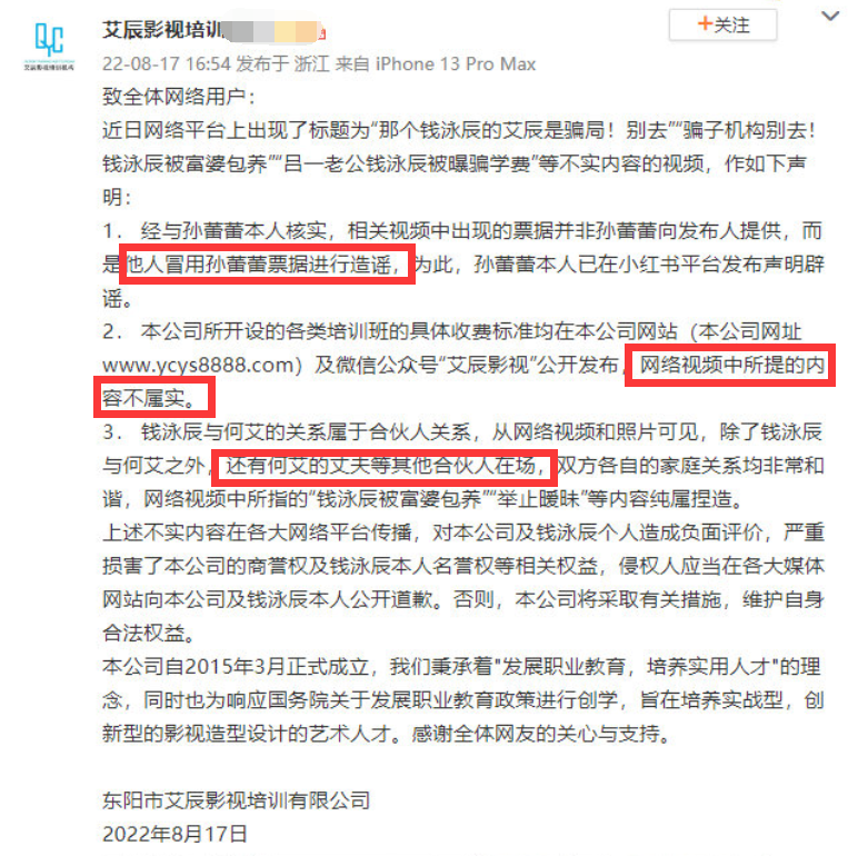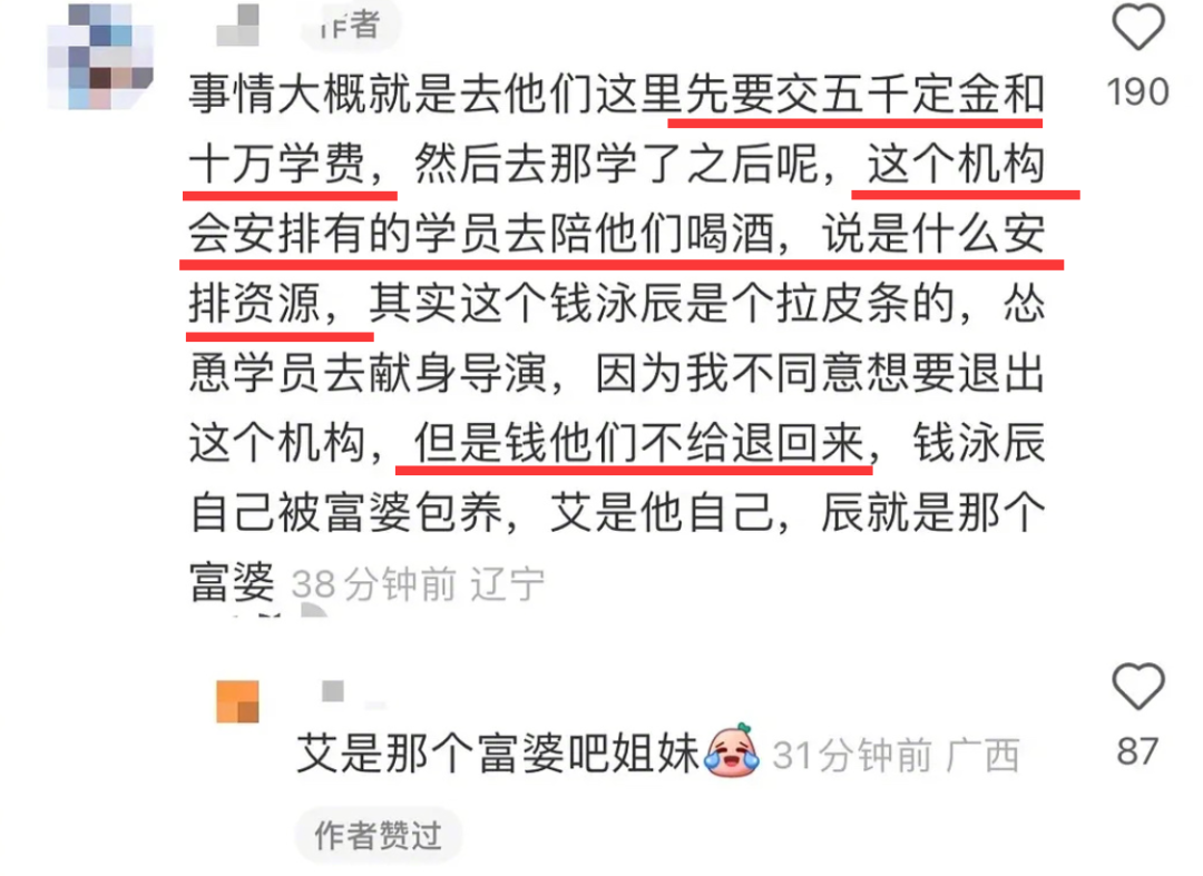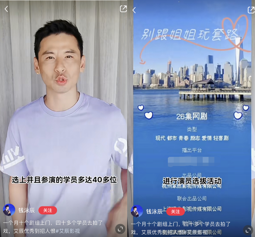 和钱泳辰高度绑定的艾辰影视,是一个表演培训机构。