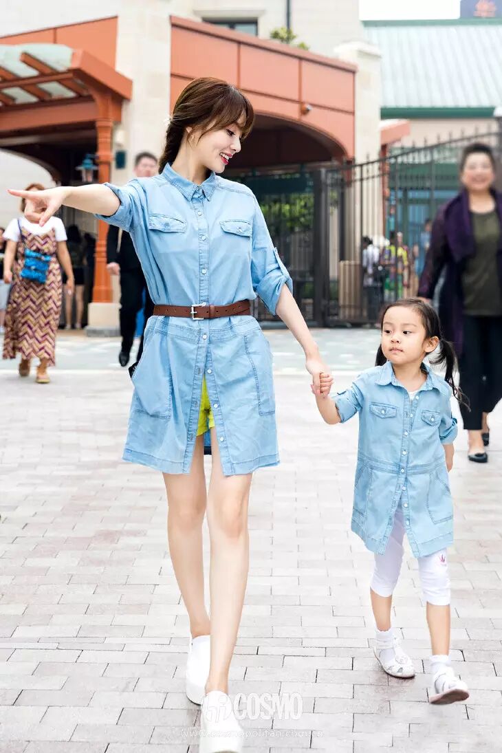 李小璐与综艺“一姐”甜馨儿穿着亲子装游迪士尼乐园,单宁连衣裙舒适又俏皮。
