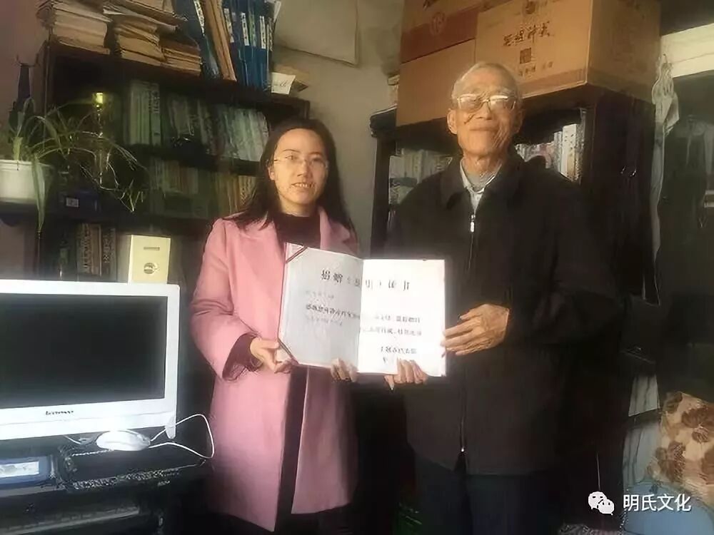 ▲图为八旬的明邦春老人将十几年从事本地谱牒编修的成果捐赠十堰市档案馆工作人员