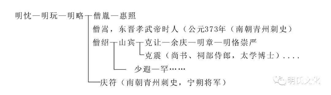 在山东德州市东南(古鬲县),出土的墓碑记载了明襄世系:明襄——明丕(远绥将军、太守)——明协(太守)——明赍(太守将军)——明湛(参军)——明道会……