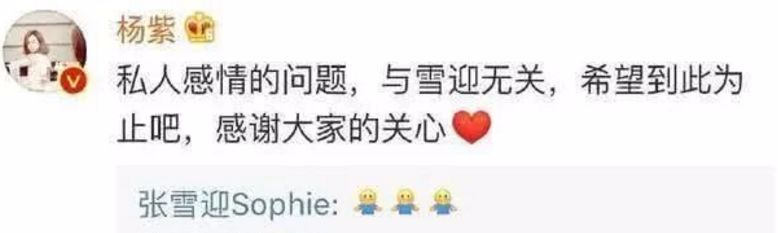 整观这场恋爱,俩人大概谈了一年的时间,以和平分手的形式告别恋人关系,当初很多人都怀疑有第三者张雪迎的加入,导致两人恋爱关系受损,但是后来杨紫力证只是自己情感问题,和张雪迎无关,才让这场误会戛然而止。