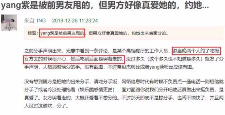 网友在文中表示,当初杨紫和秦俊杰分手,是秦俊杰邀请杨紫去吃饭,杨紫本来兴高采烈的进去,没想到却是哭着出来,从曝光的内容来看,杨紫是被分手的一方,如果原因真是这样,不得不让人心疼我们的小猴子了。