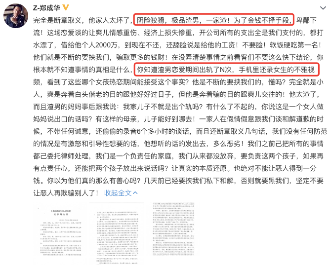 郑爽爸爸也发文了,给了弃养的理由是,渣男出轨n次,手机里还有不雅视频,还欠了2000万不还钱。