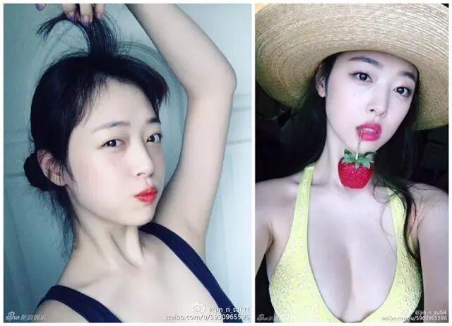 6月16日,韩星雪莉在微博上晒出性感泳装照,雪莉口咬草莓,身穿黄色比基尼酥胸半露,大方展露性感一面。