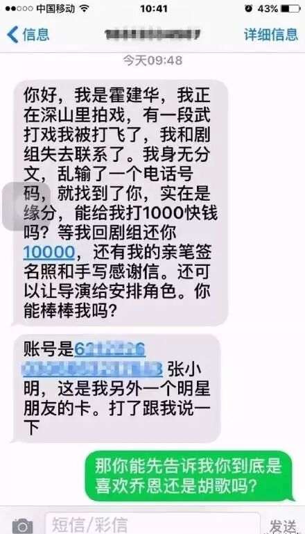 其实这样的事不是少数,有些骗子就算是知道有这么个明星,偏偏还要来秀智商,比如我们的老干部霍建华就遇到过被骗子冒名撞骗的事: