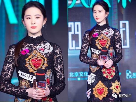DG这件黑色蕾丝透视装,很容易有太过繁复的感觉,但刘亦菲利用最简单清爽的后梳马尾发型+同样清淡的妆容,很好的撑了起来,点个赞。