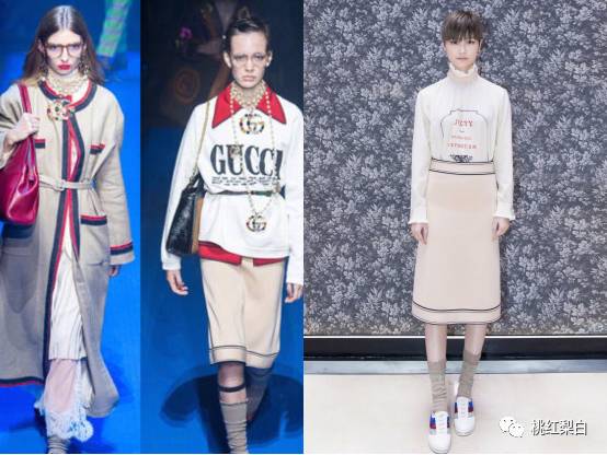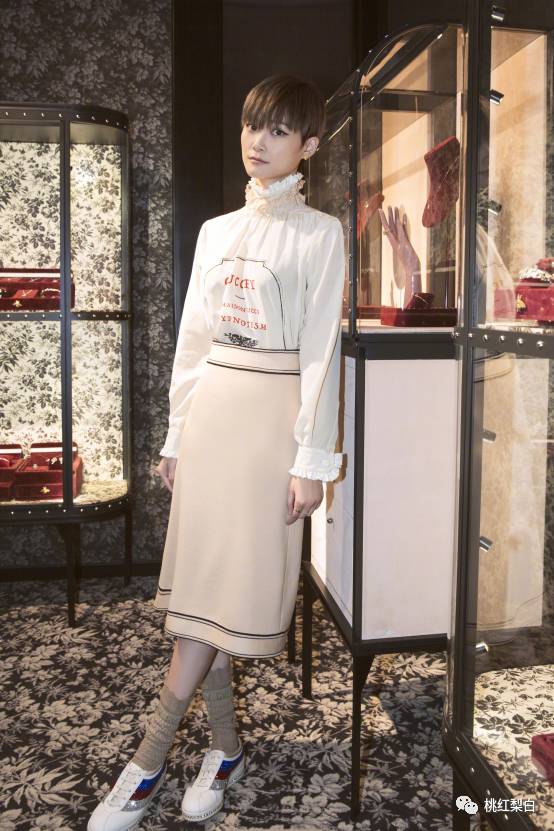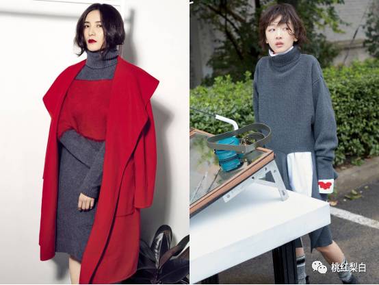 没有照搬秀场模特的整身look,而是别出心裁的用两套造型来了次小混搭,自带典雅感的白色高领衫,配上看起来同样简洁大气的裸粉色高腰过膝裙,整体视觉效果既时髦又不失小优雅。
